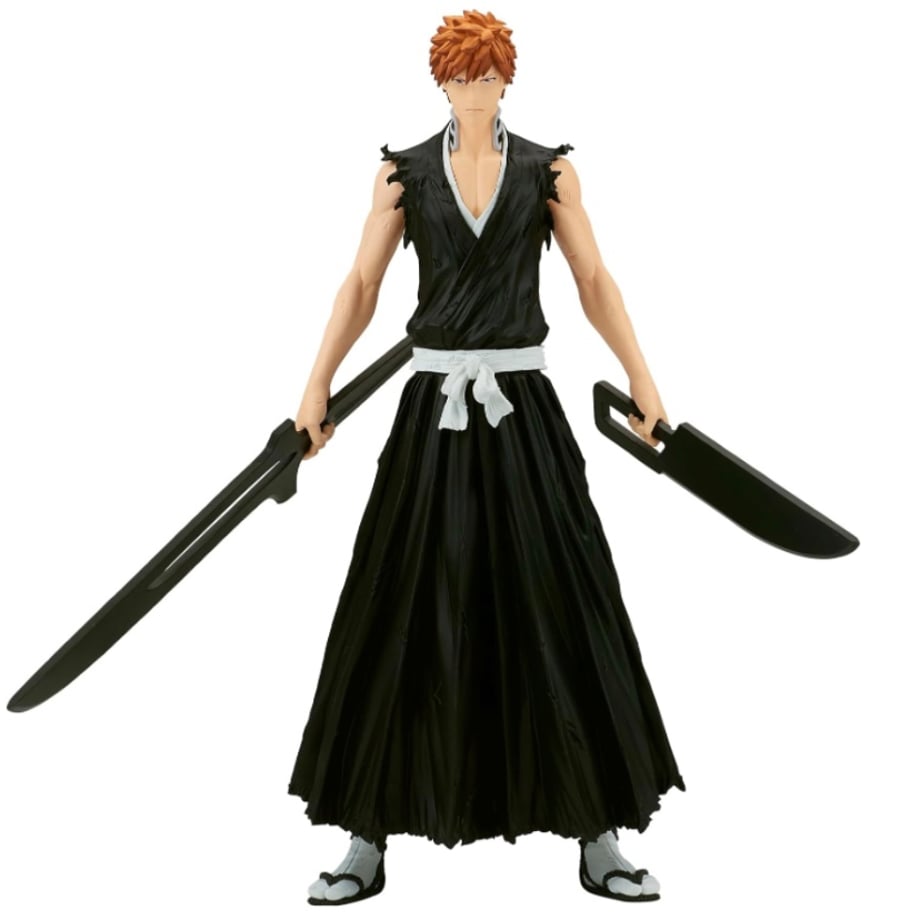 From the SOLID AND SOULS series, which features various characters from BLEACH as figures, Ichigo Kurosaki appears in his dual-sword form! The figure captures Ichigo holding his two Zanpakuto, with detailed battle scars meticulously portrayed.