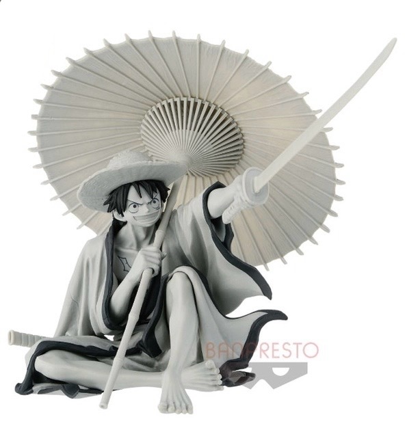 To create a “Japanese-style sculpture made by a Japanese artist,” the figure is based on a manga cover illustration, featuring Luffy with traditional items like a paper umbrella and kimono.